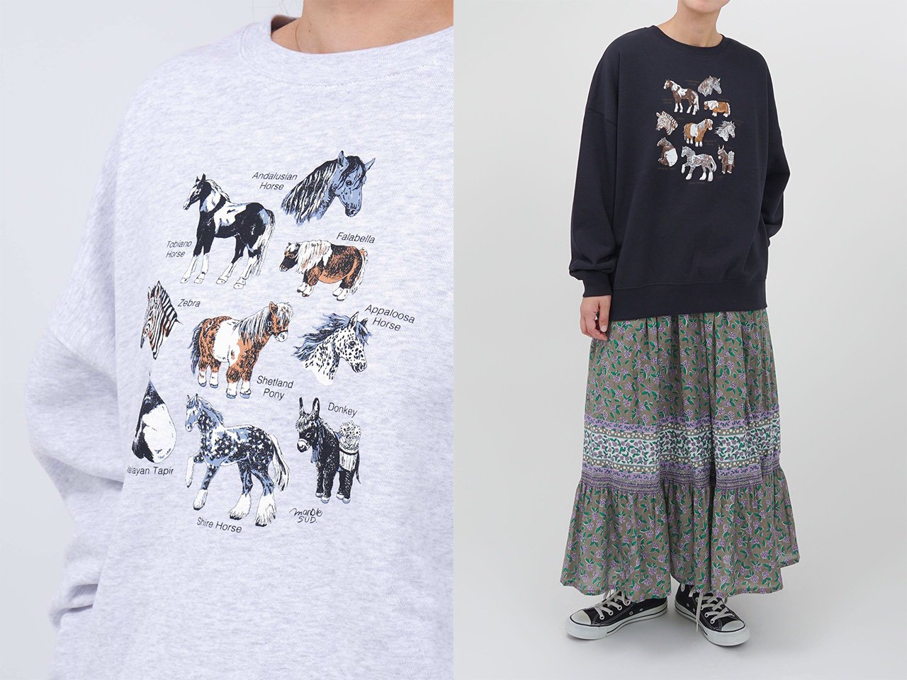 ■コットンリネンデニム フリルブラウス ¥16,940(税込)人気の図鑑シリーズ「Zukan Horse LONG SWEAT」。かしこくて身近な存在であるウマを繊細なタッチで描きました。