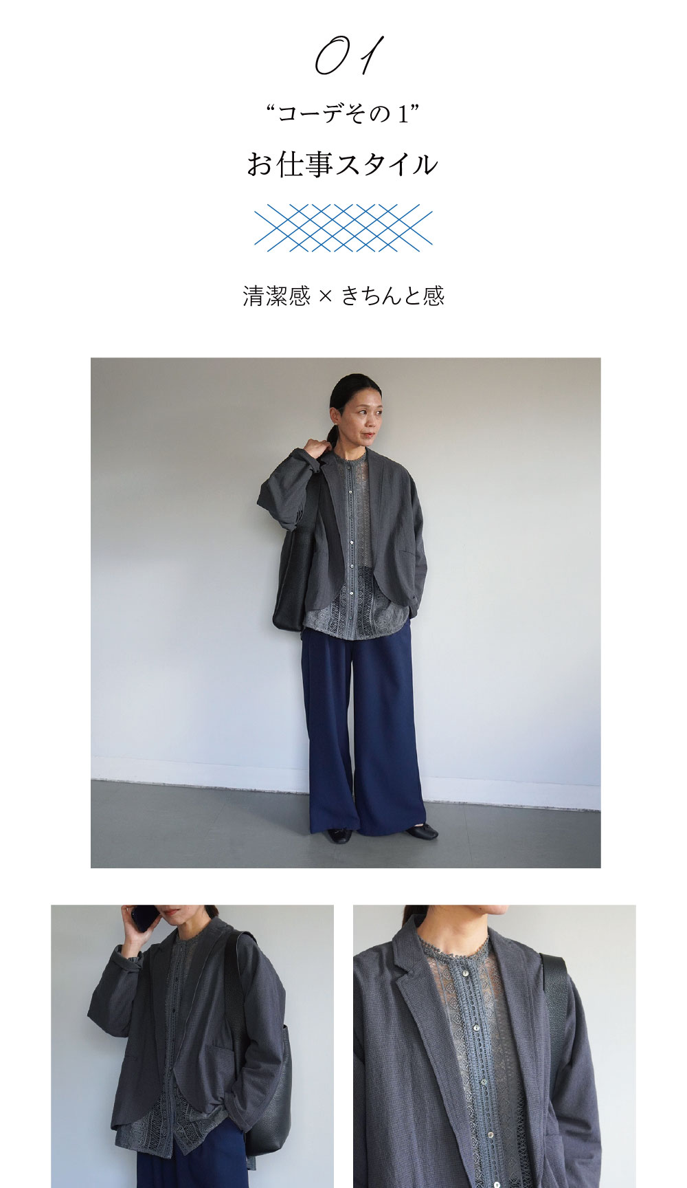 センターにあしらわれたレースのデザインがジャケットから覗くと上品な印象に。特にブラックはきちんと感が出ますよ。