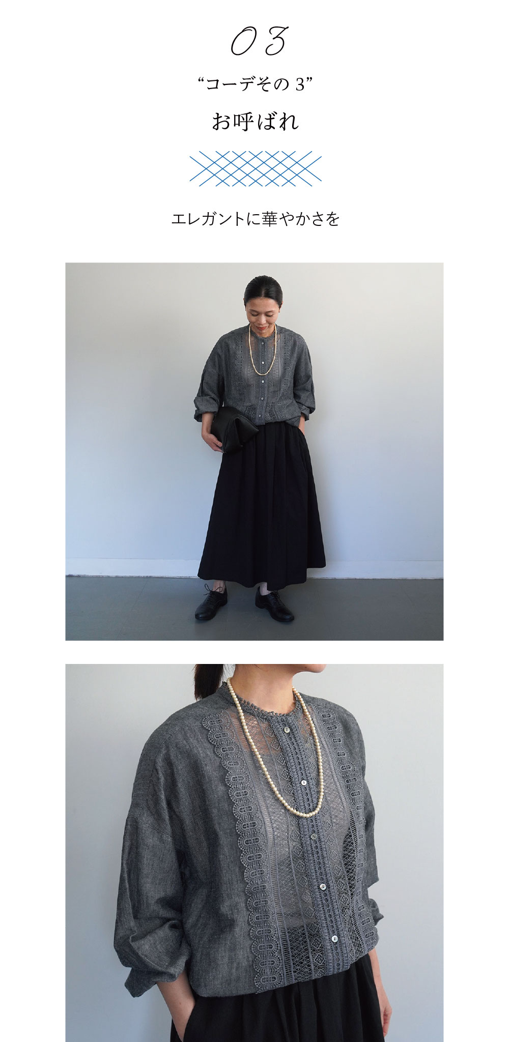 ダンガリーのさっぱりとした風合いに、繊細なレースを重ねた「ダンガリーレースシャツ」は、甘さと凛とした空気をあわせ持つ存在です。