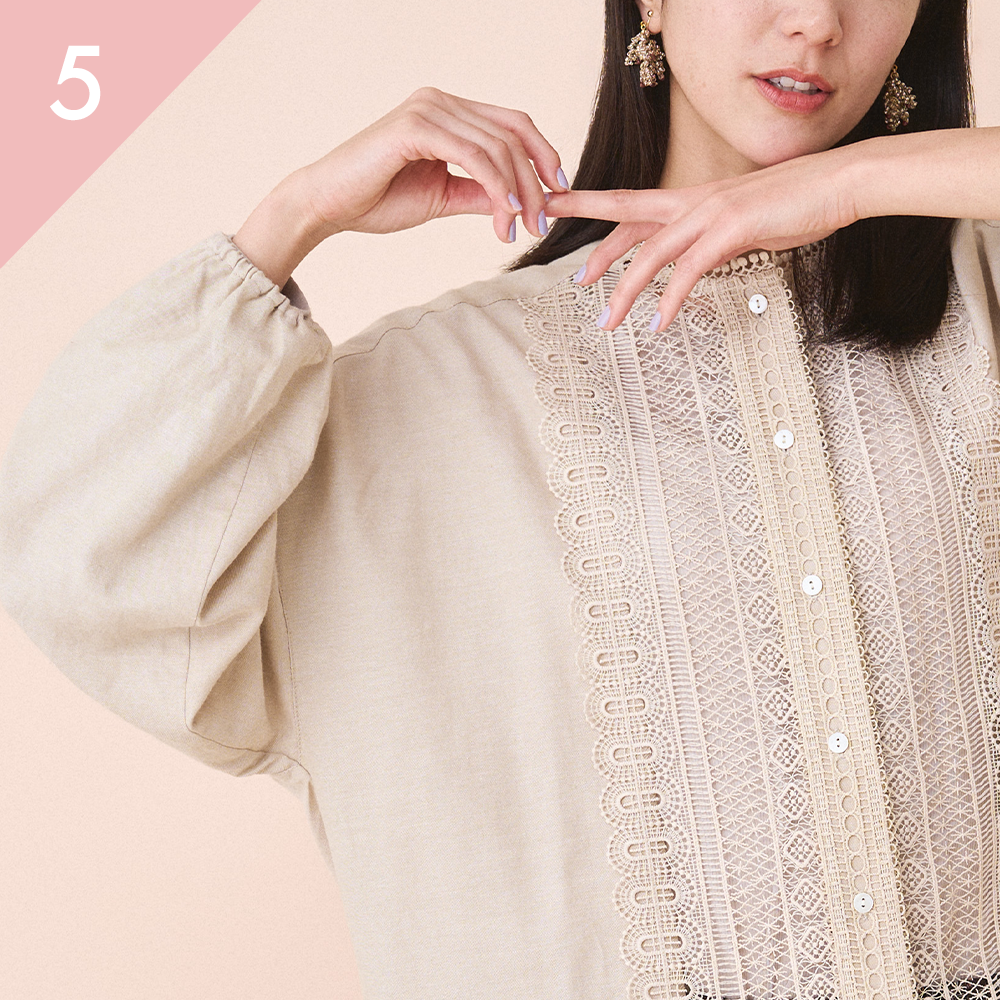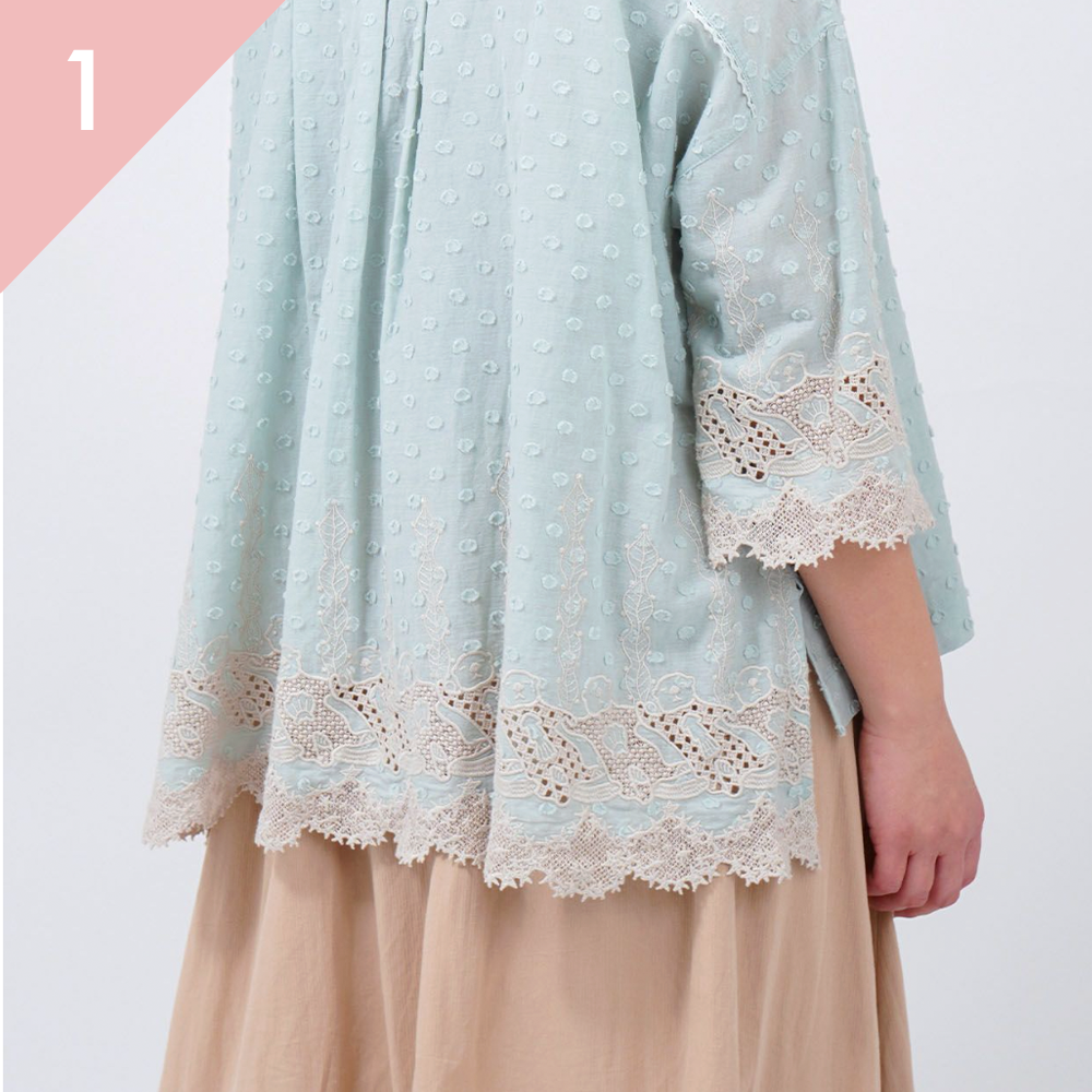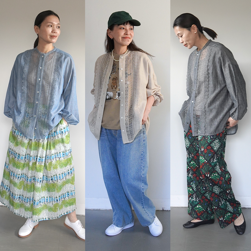 同じシリーズの、フリルスタンドカラーブラウスやクレリックシャツワンピースも人気ですが、すっきりした襟ぐりと、後ろの裾と袖口のレースが好評です。程よいシアー感で、夏場のはおりとしても大活躍間違いなしの1着です。