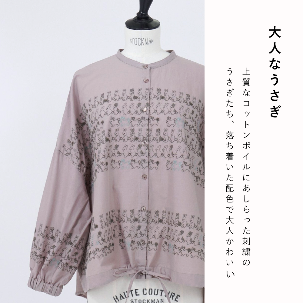 小さなうさぎたちがお行儀よく整列。落ち着いた刺繍カラーを部分使いしていて、大人かわいさが人気です。