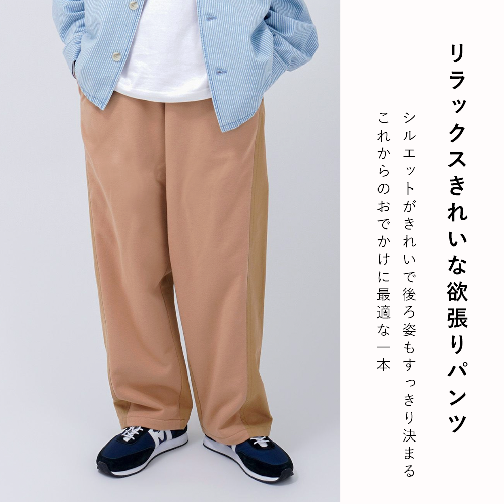 きれいに見えるリラックスシルエットにこだわったイージーパンツ。前身頃にカットソー、後ろ身頃にチノ素材を組み合わせ、縦のラインがすっきり見えます。