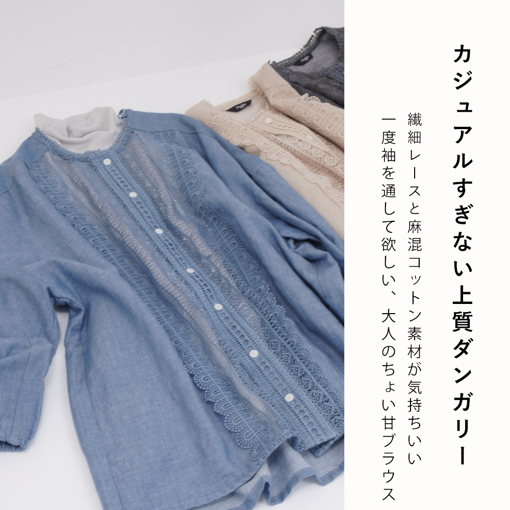 前身頃にふんだんに繊細なレースをあしらった、きれいめで華やかなダンガリーシャツ。 さらっと気持ちの良い麻混のダンガリー素材で、軽くてふんわりとしたシルエット。 リラックスも、きちんと感のある通勤スタイルにもぴったりです。