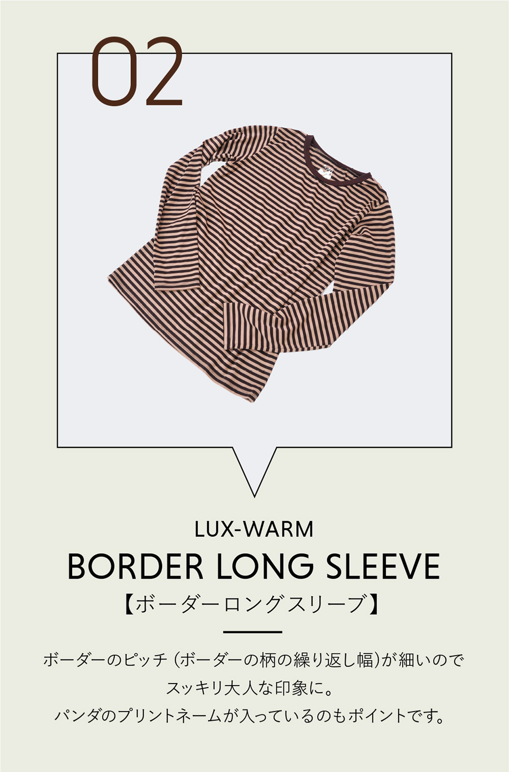 続いてご紹介するのは「LUX-WARM(ラグウォーム)」という、吸湿発熱性のある機能素材を使ったアイテム!2016年にお目見えして以来、定番として根強い人気を誇る存在です。薄手でも温かく、さらにトレッチ性も抜群で動きやすい!毛羽立ちや毛玉ができにくいのも嬉しいポイントです。